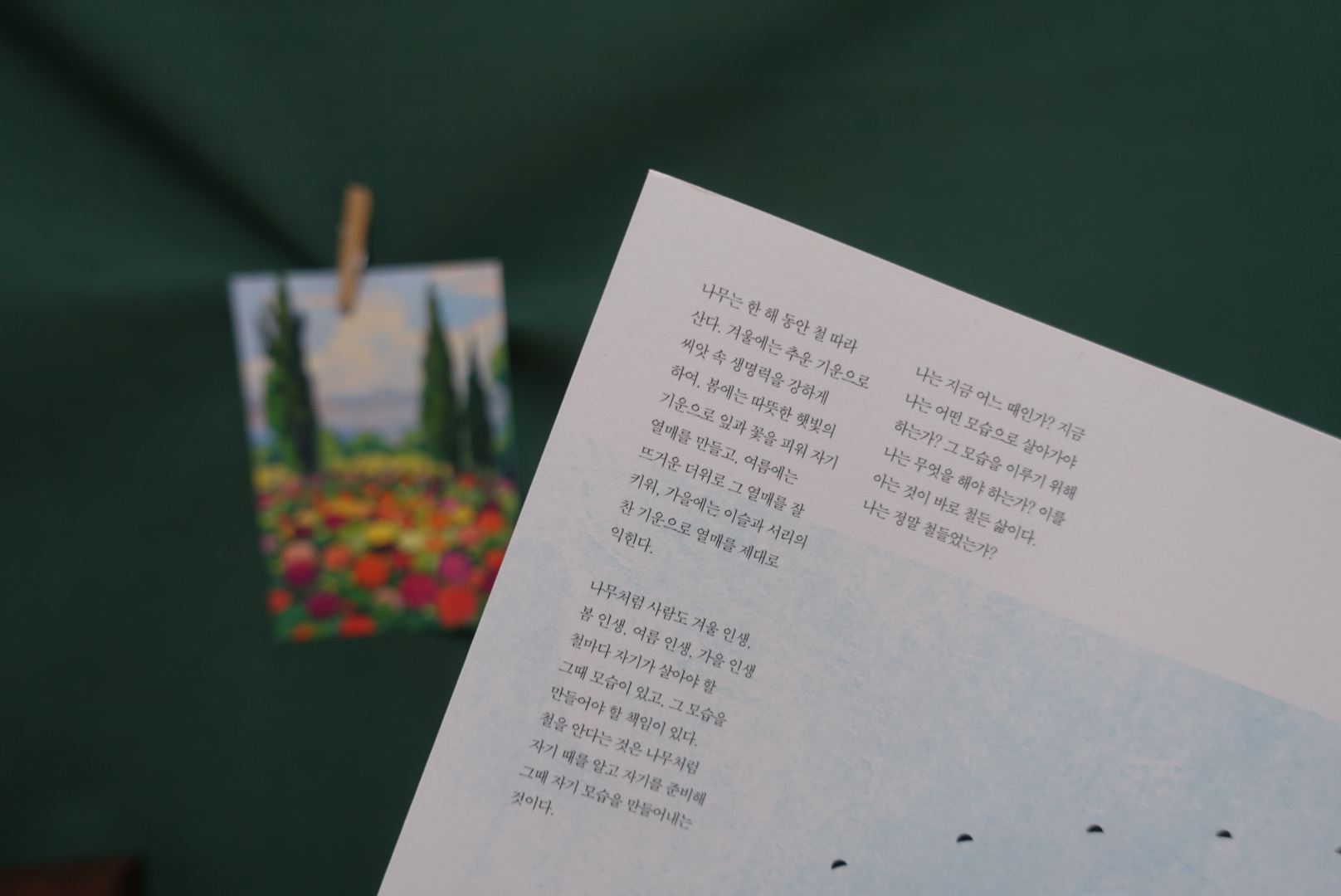“철 들고 철을 알고 살아가야 하는 이유는 때는 나를 기다려주지 않기 때문이다. (중략) 농부가 봄에 씨앗을 준비하지 못해 제때 뿌리지 않는다면 가을에 열매를 거둘 수 없는 것처럼. 때는 미리 알고 준비하는 자의 것이다. 누구에게나 봄은 오지만 아무에게나 봄은 아니기 때문이다.” (24쪽)